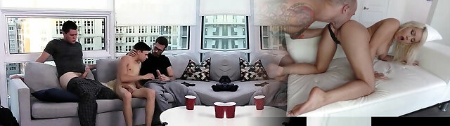 Naughty mega-slut sucking and jerking off two straight twinks